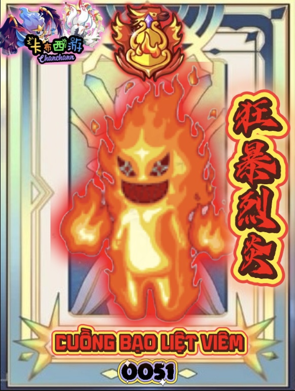 ![]() | ![]() | 怒火新生 [NỘ HỎA TÂN SINH] Loại: Vật lí Thuộc tính: Hỏa Sức mạnh: 145 PP: 5 Mô tả: 25% hồi lại 1/5 HP tối đa của bản thân | 7 | 15% |